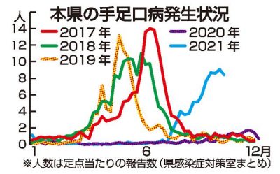 2021/11/19県内一般ニュース例年は夏に乳幼児が多く感染する手足口病が、県内で流行している。本県1医療機関当たりの報告者数は9・1人(1~7日)と全国最多となり、季節外れの流行に県感染症対策室は「昨年は大きな流行がなかったため、感染していない人の間で今後広がる恐れがあ...