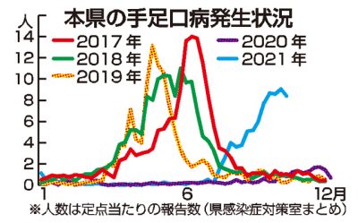 2021/11/18社会news例年は夏に乳幼児が多く感染する手足口病が、県内で流行している。本県1医療機関当たりの報告者数は9・1人(1~7日)と全国最多となり、季節外れの流行に県感染症対策室は「昨年は大きな流行がなかったため、感染していない人の間で今後広がる恐れがあ...