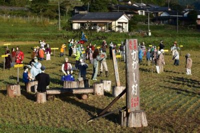 収穫後の田んぼ観光地に 美郷町かかし村にぎわう