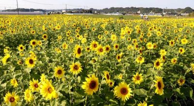 一面の黄色いじゅうたん 清武で季節外れのヒマワリ満開