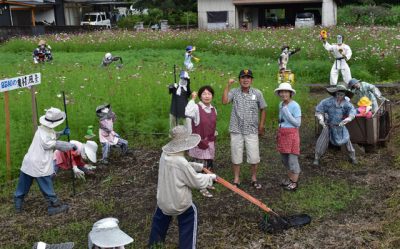住民手作りかかしとコスモス共演 都農町長野地区