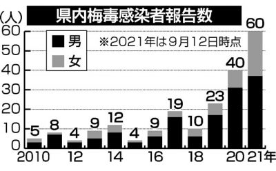 2021/09/24県内一般ニュース性行為などによって感染する「梅毒」の県内の今年の感染者数が60人(12日時点)となり、統計を取り始めた1999年以降最多だった2020年の40人を既に超えたことが県感染症対策室のまとめで分かった。女性の感染者数の増加が目立ち、同年9人から...