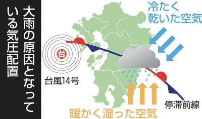 2021/09/17県内一般ニュース本県平野部を中心に続く大雨について、宮崎地方気象台は16日、県央部付近の上空を東西に貫く前線と台風14号の気圧配置が変わらないため、大雨が長期化しているとの見解を示した。前線に影響を与える上空の西風が弱かったことも、気圧配置が変わらない要...
