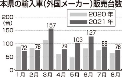 2021/09/15経済企画県内で輸入車の販売が伸びている。日本自動車輸入組合(JAIA)の発表によると、8月の外国メーカーの新車登録台数は前年同月比16.9%増の76台。6カ月連続で前年を上回り、1月からの累計は26.7%増の779台だった。 県内では1月...