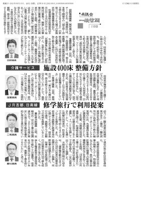 2021/09/15紙面から/2日目/介護サービス/施設400床 整備方針/JR吉都、日南線/修学旅行で利用提案 図師博規議員(無所属の会チームひむか、児湯郡区)は、本県で開催中の「国文祭・芸文祭みやざき2020」の新型コロナウイルス禍での実施状況と開催意義を...
