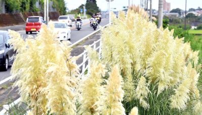 風に揺られ秋の気配 高鍋・パンパスグラス白い穂付ける