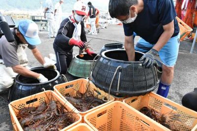 伊勢エビ漁解禁 初水揚げに活況 日南・富土漁港