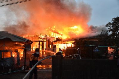 2021/08/25県内一般ニュース24日午前5時5分ごろ、高鍋町持田、公務員井戸川隆さん(49)方から出火、住宅と倉庫を全焼した=写真。高鍋署によると、井戸川さんは5人暮らし。井戸川さんと40代の妻、20代の長男が住宅2階から飛び降りた際に骨折ややけどなどのけがをした。命...