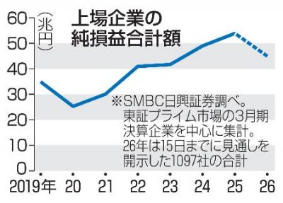 2025/08/18国内外ニュース 主要上場企業の2026年3月期の純損益合計額が44兆9397億円の黒字となり、前期比で7・8%減る見通しであることが18日、SMBC日興証券の集計で分かった。減益は6年ぶりとなる。米国の高関税による負担増で自動車など製造業を中心とした不振が響...