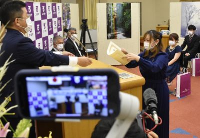 2021/08/16地域の話題五ケ瀬町の成人式は16日、町議会議場であった。新型コロナウイルス感染拡大を受け、昨年に続き一部オンラインで開き、新成人81人のうち町内在住の7人のみが出席。式の模様はオンラインで生配信し、町外から約20人が視聴した。 会場では、原...