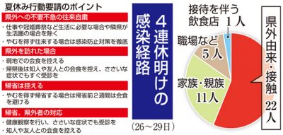 2021/07/31県内一般ニュース22~25日の4連休明けに宮崎県内で確認された新型コロナウイルス感染者39人のうち、5割超の22人の感染経路が大阪府や福岡県などの県外由来だったことが30日、県のまとめで分かった。多くが県外者との会食歴があった。直近の県内の感染者数は4日...