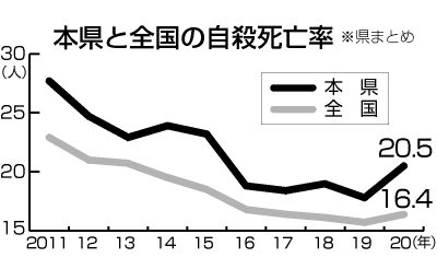 2021/07/14県内一般ニュース2020年の本県の自殺死亡率(人口10万人当たりの自殺者数)は20・5人で、全国で2番目に高かったことが13日、厚生労働省の人口動態統計(概数)に基づく県のまとめで分かった。自殺者数は過去20年で最も少なかった19年比で27人増の217人...