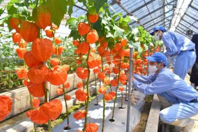 2021/06/29トピックnews宮崎市の宮崎農業高(奥村昌美校長、538人)内のハウスでホオズキの実が鮮やかな朱色に色づいている。29日には、収穫を前に生物工学科の生徒14人が仕上げの手入れに精を出していた。 ホオズキは夏でも出荷でき、お盆飾りとして需要が高いこ...