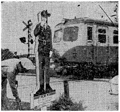 2021/06/15懐かしシリーズ増加する鉄道事故防止に―と、宮崎鉄道公安分室は14日午後、宮崎市浄土江町の一ツ葉道路踏切の両側に、公安官の実物大の人形2体を立てた。 踏切を通過する自動車、自転車乗りが人形を見掛けるたびに注意して正しい踏切横断をしてもらおうという...