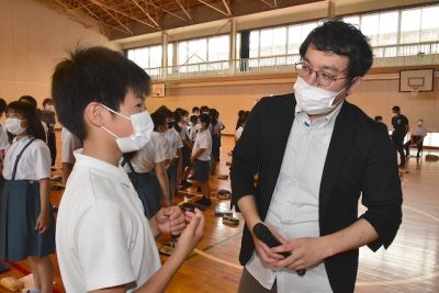 児童らに英語学ぶ楽しさを 小林・細野小で特別授業