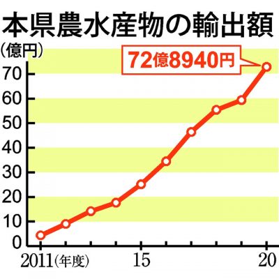 2021/06/11県内一般ニュース2020年度の本県農水産物の海外輸出額が、72億8940万円(確定値)だったことが10日、県のまとめで分かった。9年連続で過去最高を更新し、前年度からの増加額は過去最大の13億4950万円だった。インターネット通販などで牛肉や鶏卵、水産物...