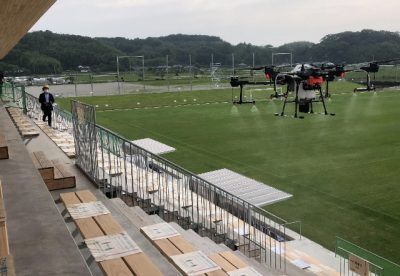 2021/05/27一般スポーツ安心して観戦を―。J3テゲバジャーロ宮崎の専用スタジアム「ユニリーバスタジアム新富」で26日、小型無人機ドローンを用いて消毒作業が行われた=写真。 コロナ禍での試合観戦を後押ししようと、クラブのスポンサーである宮崎市の清掃業「宝ビ...