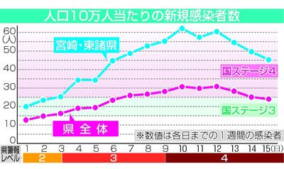 2021/05/17県内一般ニュース新型コロナウイルスの感染拡大が続く中、宮崎・東諸県圏域では、直近1週間の人口10万人当たりの新規感染者数が40~60人台と、国のステージ4(爆発的感染拡大)目安の25人を大幅に超える状況が続いている。宮崎市では5月に入り、クラスター(感染...