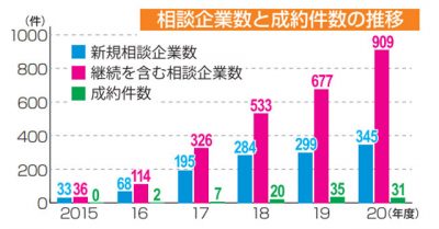 2021/05/12経済一般中小企業や個人事業主の事業承継を支援する県事業承継・引継ぎ支援センター(宮崎市)の2020年度の相談件数(継続を含む)が前年度比34.2%増の計909件となり、最多を更新したことが同センターのまとめで分かった。新規相談も345件で最多。コ...