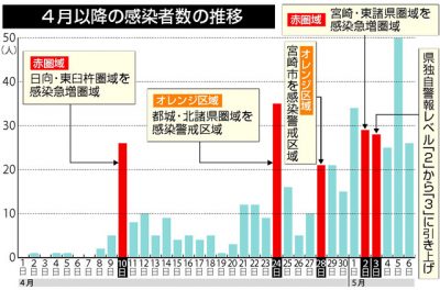 2021/05/06社会news県と宮崎市は6日、新たに10歳未満~60代の男女26人の新型コロナウイルス感染を確認し、1人が死亡したと発表した。また、延岡市の接待を伴う飲食店で、今月に入って6例目となるクラスター(感染者集団)が発生したことも明らかにした。5日は50人...