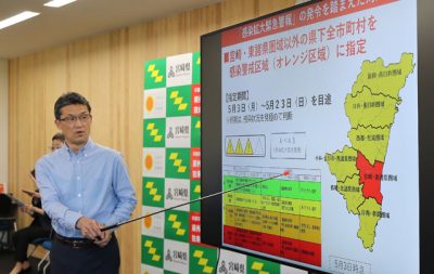 2021/05/04県内一般ニュース県は3日、県内外での新型コロナウイルスの感染急拡大を受け、県全域に発令中の県独自警報レベル(0~4段階)を、上から2番目に深刻な「3(感染拡大緊急警報)」に引き上げた。さらに県独自の感染区分「感染急増圏域(赤圏域)」に指定している宮崎・東...