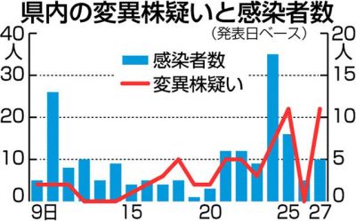 2021/04/28県内一般ニュース従来より感染力が強いとされる新型コロナウイルス変異株疑いの感染が、県内で急拡大している。今月9日の初確認の発表以来、疑いのある感染者数は増加傾向で、県は27日、新たに11人を発表。県内累計は63人に上っており、4月に発表された県内の感染者...