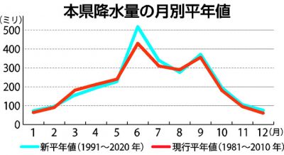 2021/04/27社会news気温や降水量、天候の基準となる気象庁の平年値が10年ぶりに更新され、この30年間の本県の梅雨や台風シーズンの平均降水量(月別)が現行値から5~20%増えていることが分かった。10年間の気候変動が数字に表れた形で、識者は「梅雨や台風の時期に...