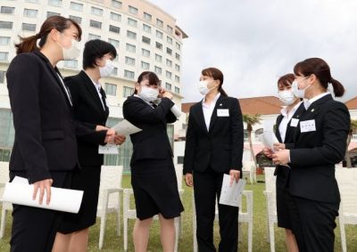 コロナ負けず「笑顔」 青島のホテルで入社式