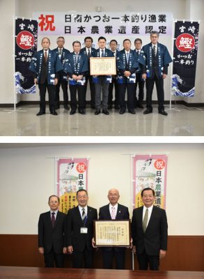 2021/03/18県内一般ニュース伝統的で重要な農林水産業を営む地域として、農林水産省の「日本農業遺産」に県内で初めて認定された、日南市の「かつお一本釣り漁業」と、宮崎市田野・清武地域の「干し大根と大根やぐら」の関係者に17日、認定証が授与された。今回認定された全国4県7...