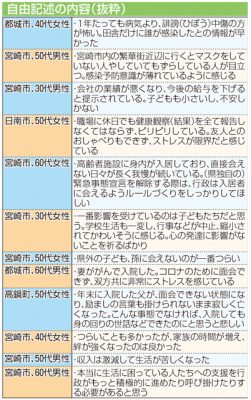 2021/03/03社会news「ストレスは限界」「家族に会えずつらい」―。新型コロナウイルス県内初確認から1年に合わせ、宮崎日日新聞が「宮日ネットリサーチ」を使って実施したアンケート調査の自由記述には多くの意見が寄せられた。仕事や学業、自粛、誹ひ謗ぼう中傷、感染への不...