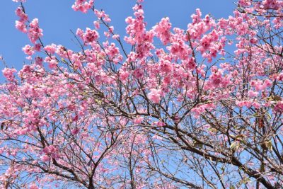 鮮やかなピンクの花 見頃 都農・岩本さん方「ヒマラヤアキザクラ」