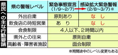 2021/02/08県内一般ニュース新型コロナウイルス感染急拡大に伴い、県が発令していた独自の緊急事態宣言は7日終了し、8日以降の県全域の警報レベルは「感染拡大緊急警報(3)」、県独自の感染区分は感染警戒区域(オレンジ)となる。県は感染が再び拡大しないよう会食の人数や時間の...