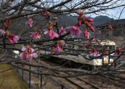 一足早い春演出 日南・北郷駅で早咲き桜ほころぶ