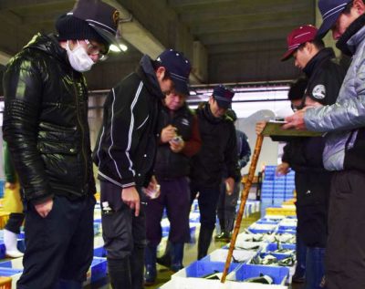 2021/01/04きょうの出来事日南市南郷町・南郷漁協(江藤久義組合長)の今年最初の競りが4日早朝、同漁協の荷さばき所であった。鮮魚を買い求める仲買人ら約70人が来場。威勢のいい掛け声が響き渡った。 荷さばき所内には、水揚げされたばかりのシロアマダイやアジ、ニベ...