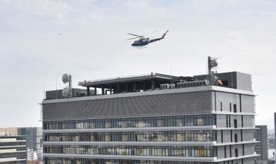 防災救急ヘリ離着陸訓練 県防災庁舎、ヘリポート初使用