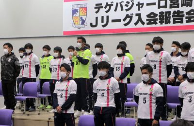 2020/12/15県内一般ニュースサッカー・Jリーグ3部(J3)に来季から県勢で初めて参入するテゲバジャーロ宮崎は13日、宮崎市・宮交シティでJ入会報告会を開き、サポーターら約100人を前に、感謝と来季に向けた意気込みを述べた。 例年のファン感謝祭に代えて実施。二...