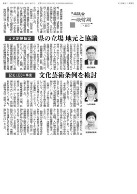 2020/12/02紙面から/4日目/日米訓練協定/県の立場 地元と協議/記紀1300年事業/文化芸術条例を検討 渡辺創議員(県民連合宮崎、宮崎市区)は新富町・航空自衛隊新田原基地での日米共同訓練に関して、5市町が福岡防衛施設局(現九州防衛局)と2007年に締...