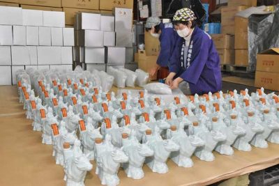 2020/11/29地域の話題日南市大堂津4丁目の古澤醸造(古澤昌子代表社員)で、来年の干支(えと)・丑(うし)にちなんだ焼酎の出荷作業がピークを迎えた。県内外に2千本を出荷予定で、箱詰めなどに追われている。 「干支壺(つぼ)」の商品名で発売して36年目。今年...