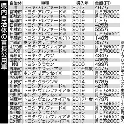 2020/11/22県内一般ニュース知事公用車に最高級車センチュリーを採用した兵庫県に対し批判が上がり、一方で長野県は同じ車種の売却を決めるなど、公用車に注目が集まっている。宮崎日日新聞が、本県と県内26市町村に首長公用車について尋ねたところ、27自治体のうち21がミニバン...