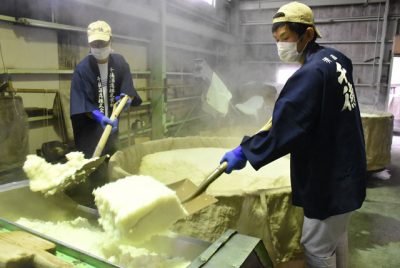 2020/11/18県内一般ニュース県内唯一の清酒専門蔵の「千徳酒造」(延岡市、門田賢士社長)で、年末年始に向けて新酒の仕込みが始まった。蒸し上がった酒米の湯気が立ちこめる中で、杜氏(とうじ)や蔵人(くらんど)たちが連日早朝から、作業に打ち込んでいる。 17日は県産...