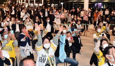 2020/10/28県内一般ニュースプロ野球・福岡ソフトバンクホークスが3年ぶり21回目のパ・リーグ優勝を決めた27日、キャンプ地・宮崎市のJR宮崎駅西口駅前広場ではパブリックビューイング(PV)があり、ファン約350人が喜びに沸いた。「この勢いでクライマックスシリーズ(C...