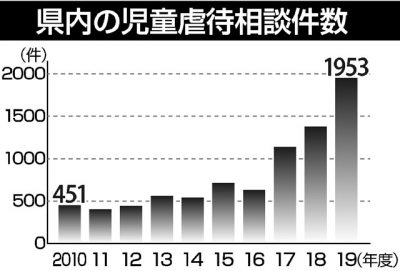 2020/10/27県内一般ニュース県内の3児童相談所(中央、都城、延岡)に寄せられた2019年度の児童虐待の相談件数は1953件で、過去最多だった前年度の1・4倍に上ったことが26日、県のまとめで分かった。児童虐待防止への社会的関心の高まりを背景に、実際には虐待リスクが低...