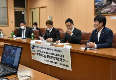 2020/10/24地域の話題日向市の青年3団体は19日、同市と結んだ災害時協力協定に関する意見交換会を開いた。新型コロナウイルスや南海トラフ巨大地震などに備え、内容を再確認しようとオンラインで開催。計47人が参加した。 団体は日向商工会議所青年部(佐藤雅人会...