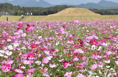 2020/10/23トピックnews西都市・西都原古墳群の秋の風物詩のコスモスが見頃を迎えている。約300万本のピンクや白、紫色などの花びらが秋風に揺れ、市民や観光客を和ませている。近く満開を迎え、11月上旬まで楽しめる。 市によると、コスモスは西都古墳まつり(今年...