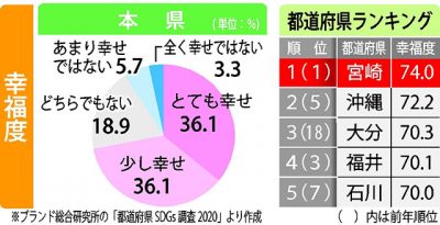 2020/10/11県内一般ニュース「愛着」「定住意欲」は後退 民間調査会社「ブランド総合研究所」(東京都)が行った「都道府県SDGs調査2020」の「幸福度ランキング」で、本県の幸福度は100点満点中74・0点となり、2年連続全国1位となった。一方で「定住意欲」や地...