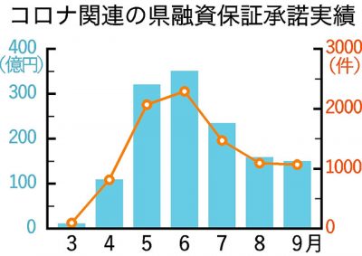 2020/10/11県内一般ニュース新型コロナウイルスの影響で打撃を受けた中小企業の資金繰りを支援する県の制度を利用した融資額が、9月末時点で1300億円を超える見込みであることが10日、県信用保証協会のまとめで分かった。2008年度のリーマン・ショック時などを上回り、上半...