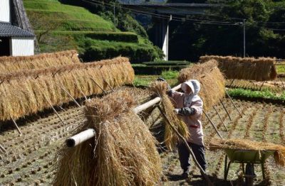 2020/10/07トピックnews朝晩の冷え込みが強まりコメの収穫期を迎えた西臼杵郡では、あちこちの棚田で黄金色の稲束が掛け干しされ、昔ながらののどかな秋の風景が広がっている。 このうち日之影町岩井川の大人集落では7日、刈り取った稲をひもで束ね、組み立てた竹ざおに...
