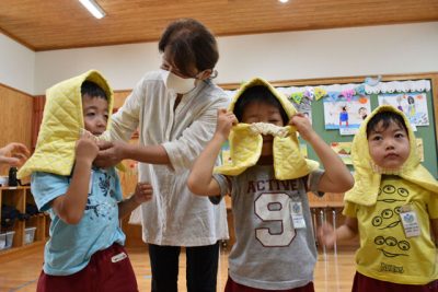 手作り防災頭巾使って 美郷の団体、園児へ贈る