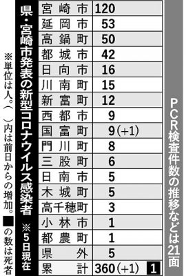 2020/09/06県内一般ニュース県は5日、新たに1人の新型コロナウイルス感染が確認されたと発表した。4日に実施したPCR検査で判明した。県内の感染確認は8月31日実施分の検査以来、4日ぶりで感染者は計360人となった。 県によると、新規感染者は国富町の70代女性...