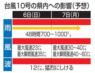 2020/09/05社会news台風10号は5日、南大東島の南南西約40キロの海上を北北西に進んだ。風速15メートル以上の強風域が拡大し、「大型で非常に強い」勢力に発達。特別警報級の勢力で7日には九州へ接近・上陸する見通し。本県は6日明け方から強風域、夜のはじめ頃に風速...